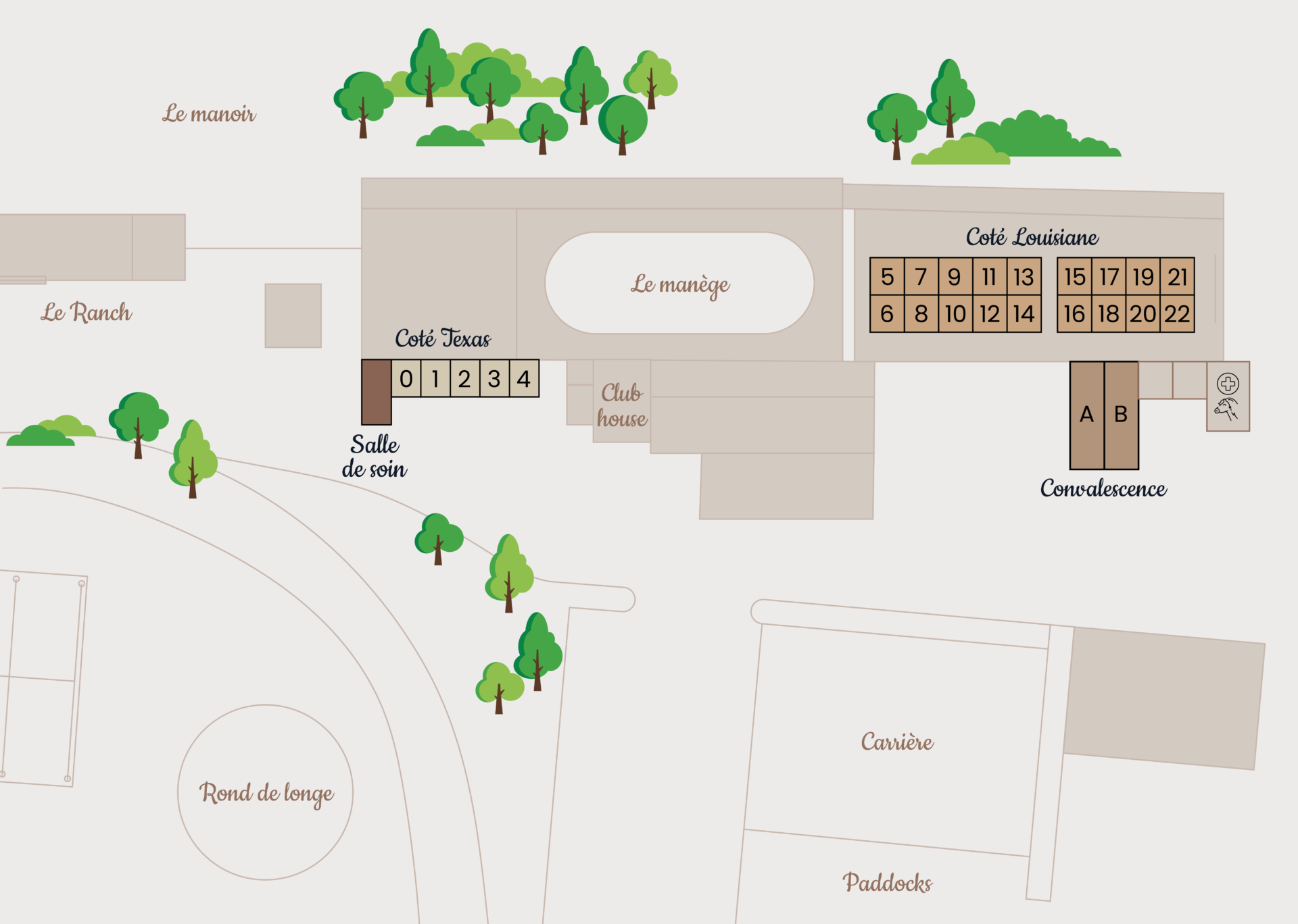 Nous vous proposons plusieurs types d’hébergements : le « Côté Louisiane », avec des boxes de 12m² en intérieur, et le « Côté Texas », qui comprend des boxes de 10m² donnant sur l’extérieur. Les chevaux sont sortis tous les jours au paddock.
